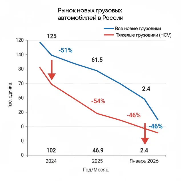 Цифры 2025-2026: Обвал рынка и смена лидеровПо итогам 2025 года рынак новых грузовых автомобилей (включая спецтехнику) в России сократился 57%, до 61,5 тыс. единиц. В сегменте тяжелых грузовиков (HCV, полная масса 16т падение было еще более драматичным минус 54%, продана всего 46,9 тыс, машин против 102 тыс. в 2024 году Январь 2026 года не принес оптимизма продажи рухнули еще на 46% относительно января прошлого года, достигнув Минимальных значений 12.4 тыс. единц. | ![]() |