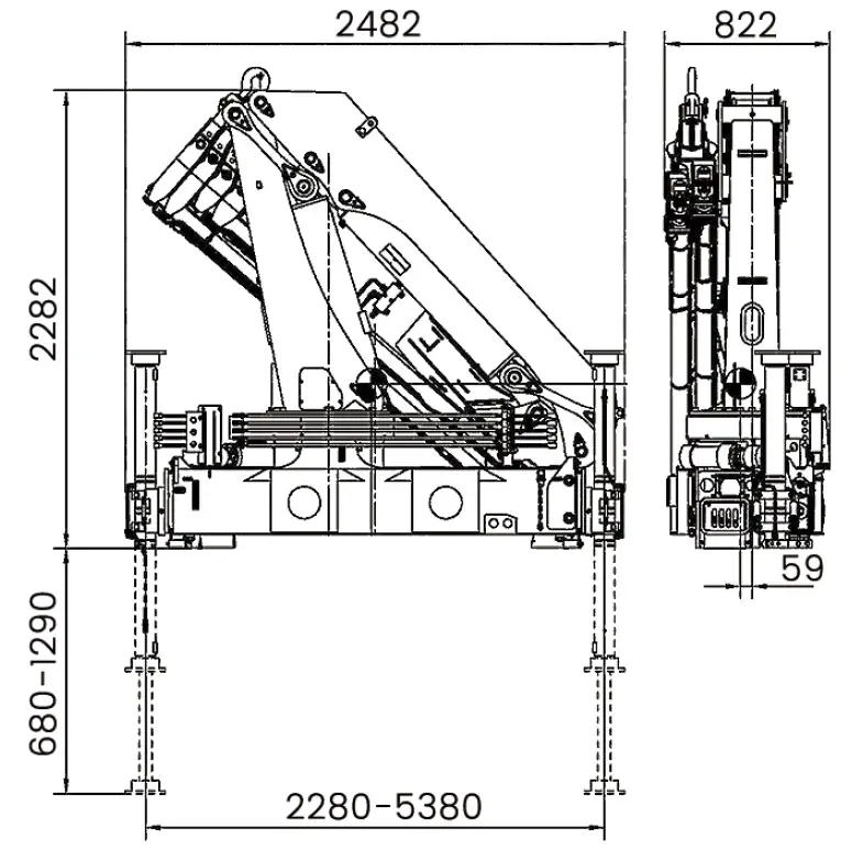 Кран-манипулятор модели Sunhunk K 125-4 служит для осуществления погрузочно-разгрузочных задач и проведения строительно-монтажных мероприятий. Эта шарнирно-соединенная установка китайского производства обладает следующими техническими параметрами: грузоподъемность составляет 6,3 тонн при минимальном плече стрелы 2 метра и 0,75 тонн при максимальном плече стрелы в 12,4 метра.