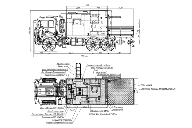 Наружная обшивка - плакированный металл белого цвета (RAL 9003) и внутренняя обшивка - плакированный металл белого цвета (RAL 9003). Обрамление фургона: наружное – алюминиевый профиль, внутреннее – алюминиевый профиль. Фургон имеет 2 уровень.