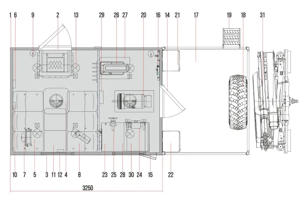 Фургон в исполнении с боковыми скосами. Наружная обшивка - плакированный металл белого цвета (RAL 9003) и внутренняя обшивка - плакированный металл белого (RAL 9003). Обрамление фургона: наружное – алюминиевый профиль, внутреннее – алюминиевый профиль.