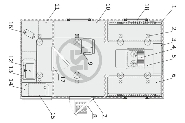 В проходном первом отсеке расположен стол со стулом оператора. Первый отсек используется для отдыха 4 человек и имеет 2 рундука, 2 откидные полки, стол с ящиком. Для комфортного проживания имеется кондиционер и отопитель.