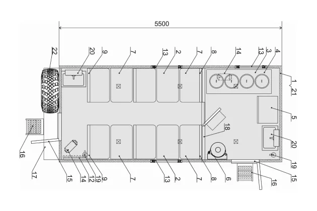 Фургон полевой кухни изготовлен из многослойных сэндвич-панелей S= 60мм. Фургон разделен на отсек выдачи пищи и отсек приема пищи. Отсеки разделены перегородкой с дверью и окном для раздачи пищи.