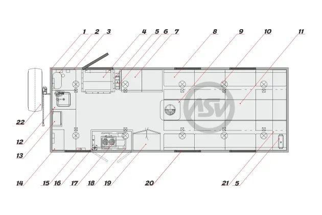 Фургон состоит из одного отсека для приготовления пищи и для приема пищи. Крепление платформы к раме шасси – с помощью кронштейнов и стремянок.