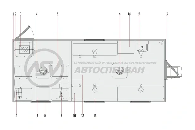 16. Дверь задняя (ограничитель, подсветка, глухое окно-стеклопакет), выдвижной трап.