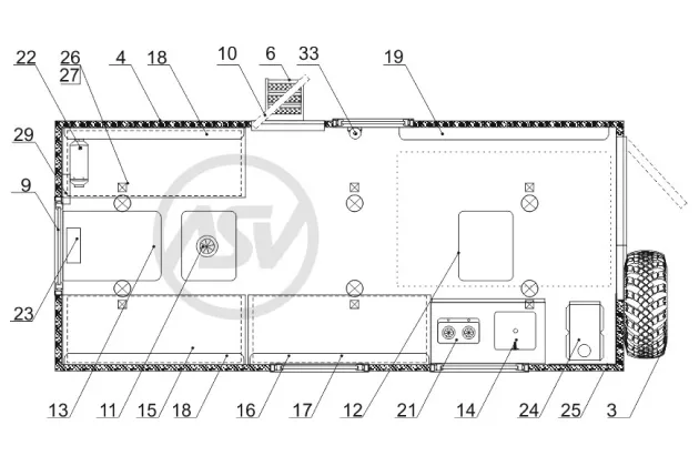 Вход в фургон осуществляется через боковую дверь с замком и ручкой. Для доступа a фургон предусмотрена съемная лестница, которая при транспортировании закрепляется под кузовом-фургоном.