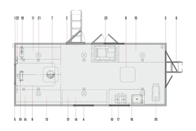 1. Кузов-фургон представляет собой конструкцию из пятислойных «сэндвич-панелей». Снаружи и изнутри фургон обшит стальным оцинкованным листом с полимерным лакокрасочным покрытием («плакированный лист»). Пространство между внешней и внутренней обшивкой фургона заполнено слоем теплоизоляционного материала, имеющего низкую теплопроводность и низкую горючесть. Для усиления конструкции между утеплителем и обшивкой находятся слой фанеры. Изнутри фургона пол покрыт автомобильным линолеумом на резиновой основе («автолин»). Фургон в исполнении с боковыми скосами. Наружная обшивка - плакированный металл синего цвета (RAL 5005) и внутренняя обшивка - плакированный металл белого цвета (RAL 9003).
