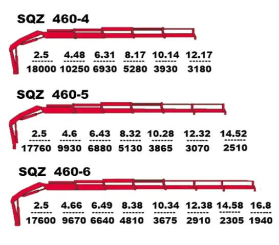 Крано-манипуляторная установка XCMG SQZ460-6 с максимальной грузоподъемностью 17.6 тонн и вылетом стрелы 16.8 метра. Имеет верхний пост управления и поворотные передние аутригреы. Установку можно дооснастить, лебёдкой, пультом дистанционного управления, грузовой корзиной, буром или захватом. Подходит для шасси с колесной формулой 6х4, 6х6, 8х4 и 8х8.