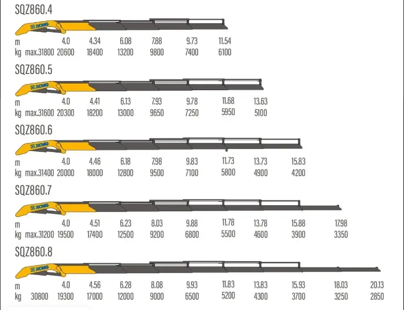 Крано-манипуляторная установка XCMG SQZ860-8 с максимальной грузоподъемностью 30.0 тонн и вылетом стрелы 20.1 метра. Имеет нижний/верхний пост управления и поворотные передние аутригреы. Установку можно дооснастить, лебёдкой, пультом дистанционного управления, грузовой корзиной, буром или захватом. Подходит для шасси с колесной формулой 4х2, 4х4, 6х4, 6х6.