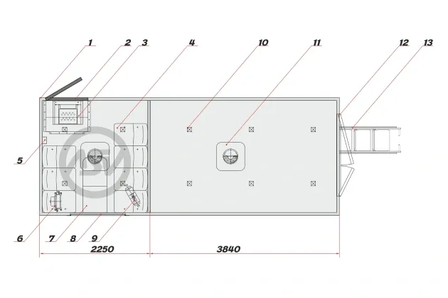 Кузов-фургон представляет собой сварную рамную конструкцию (надрамник), с установленным на ней фургоном из пятислойных «сэндвич-панелей» толщиной 60 мм, изготовлен по бескаркасной технологии. Внутренняя и наружная отделка стен и потолка – оцинкованный лист с полимерным покрытием («плакированный лист»). На полу – прорезиненное покрытие «автолин». В левой боковой панели установлены стеклопакеты с двойным остеклением, с поворотно-откидной форточкой. В корпусе фургона справа по ходу движения расположена входная дверь для пассажиров с заниженным входом, откидной лестницей и поручнем. Кузов-фургон закреплён к раме базового ТС через демпфирующую деревянную проставку посредством стремянок и кронштейнов. Кузов-фургон разделен перегородкой на два отсека пассажирский и рабочий. Пассажирский отсек предназначен для размещения пассажирских сидений для перевозки бригады до 7 человек к месту проведения работ. Рабочий отсек предназначен для размещения специального оборудования или перевозимых грузов. Для входа в рабочий отсек на заднем торце фургона предусмотрена двухстворчатая распашная дверь и лестница-трап.