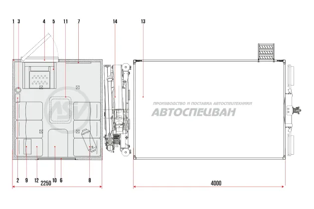 Представляет собой сварную конструкцию из металлических труб квадратного сечения, обшитых стальным листом с откидным правым бортом. Предназначена для размещения груза. Для подъема в грузовую платформу имеется выдвижная лестница.