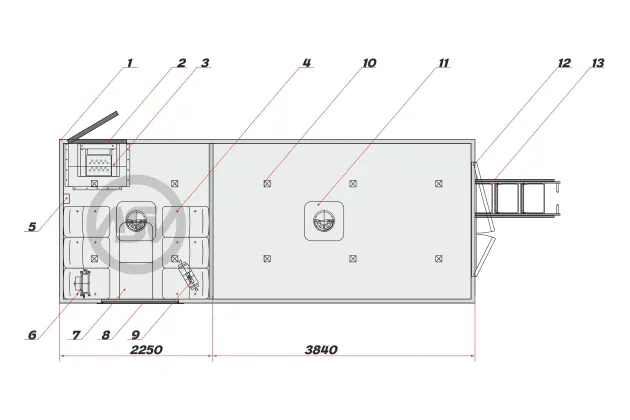 Фургон в исполнении без боковых скосов. Наружная обшивка – плакированный металл белого цвета (RAL 9003) и внутренняя обшивка – плакированный металл белого цвета (RAL 9003). Обрамление фургона: наружное – алюминиевый профиль, внутреннее – алюминиевый профиль.