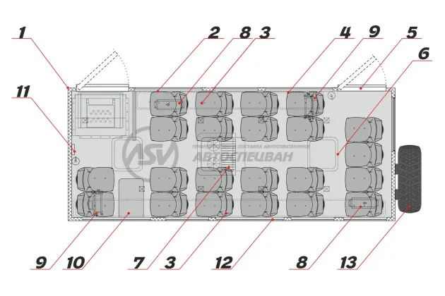 5. Задняя дверь (аварийная) оборудована качественным и надежным замком; окантована тройным контуром высококачественного уплотнителя. Вклеенный стеклопакет окна двери тонирован