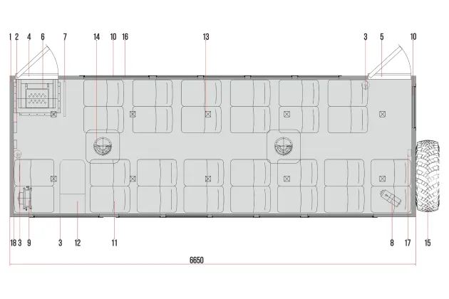 11. Сиденья сдвоенные, сертифицированные, с 3-х точечными ремнями безопасности, материал - кожзам (14 шт.)