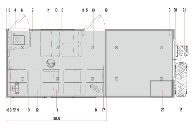 Обрамление фургона: наружное – алюминиевый профиль, внутреннее – алюминиевый профиль. Дверные проемы (порталы) из нержавеющей стали.
