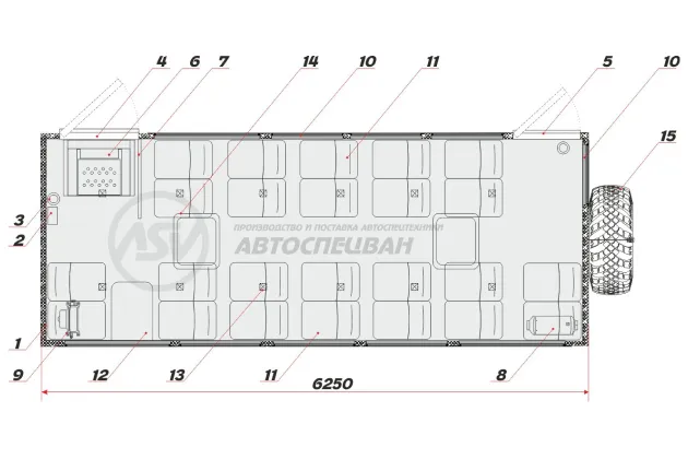 - Сиденья сдвоенные сертифицированные с 3-х точечными ремнями безопасности – 12 шт.