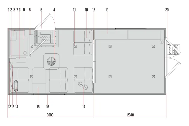 Входная боковая дверь с окном (двойной стеклопакет), с заниженным входом, с поручнем, с подсветкой, с ограничителем, с замком. Уплотнитель на алюминиевой основе со сменными лепестками из эластичной резины.