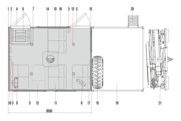В панели фургона (справа по ходу автомобиля) в передней части, предусмотрена одностворчатая дверь для входа, вход заниженный (лестничный блок с поручнем и откидной ступенью). В задней части расположена дверь аварийная с окном.