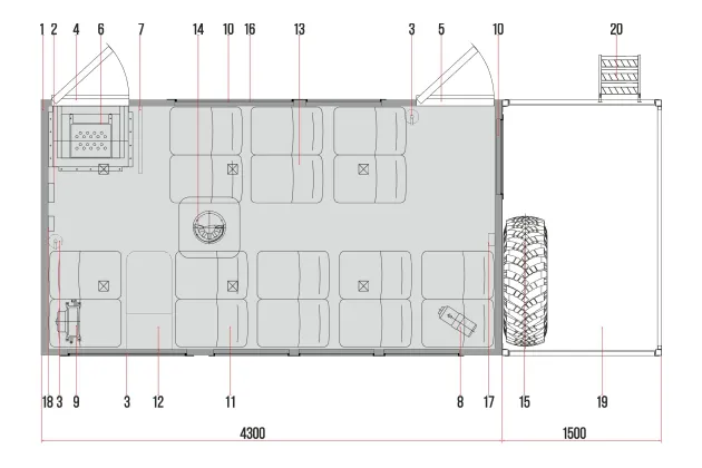 Обрамление фургона: наружное – алюминиевый профиль, внутреннее – алюминиевый профиль. Дверные проемы (порталы) из нержавеющей стали.