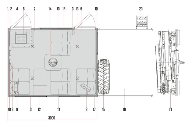 Обрамление фургона: наружное – алюминиевый профиль, внутреннее – алюминиевый профиль. Дверные проемы (порталы) из нержавеющей стали.